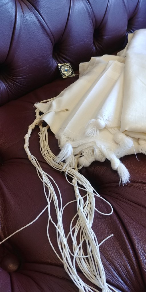 He arrives late (during Pesuqei Dezimra, which, BTW, many of us consider “early”), the old men will not offer him a seat, he is attacked by a pitcher of fruit juice, and when he finally dons his tallit, somebody points out that it is not kosher – it is missing one of the four tzitziyyot, the specially-tied strands that hang down at the corners. It is a symbol of death – some have the custom of deliberately making a tallit pesulah (not kosher) before burying it with its owner, by removing one of the tzitziyyot. The speaker grieves for himself, and realizes that the holy day has passed “belo tefillah uvelo kelum.” Without prayer and without anything.